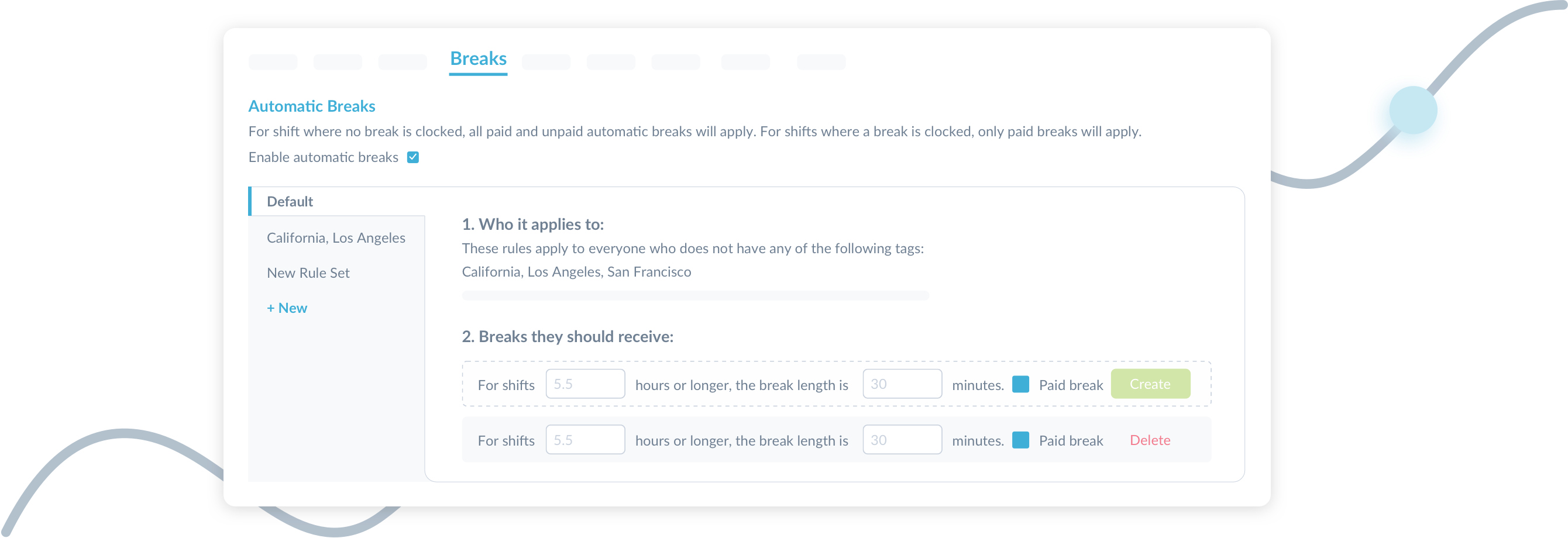 Clearly indicate and track paid and unpaid breaks on the schedule. Set them automatically, but require clocking back in to better manage de minimis breaks.
