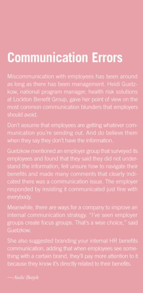 Some people prefer information communicated to them via mail, others through text messages, and others through one of the many alternative options including email and social media, according to Heidi Guetzkow, national program manager, health risk solutions at Lockton Benefit Group.